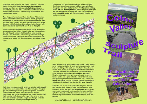 A 3 mile walk past 12 artworks located in the beautiful Pennine Colne Valley.